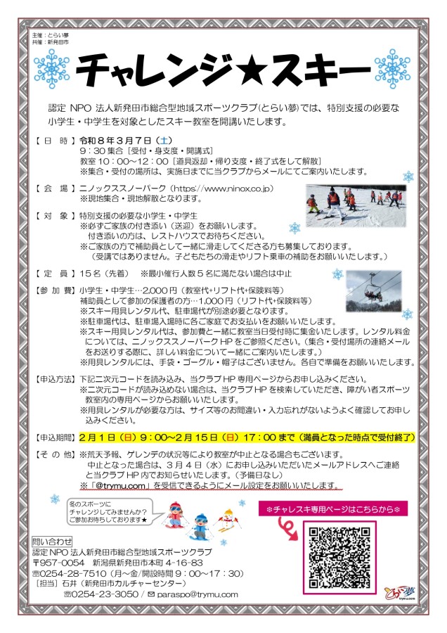参加ご希望の方は、専用ページ内(二次元コード読み込みまたはホームページ内「障がい者スポーツ教室」を選択し「チャレンジ★スキー」を選択)からお申し込みください。 ⇒チャレスキ専用ページ ※用具レンタル希望の方は、サイズ入力をお間違い・入力忘れがないようお願いいたします。 ※「@trymu.com」を受信できるように設定をお願いいたします。